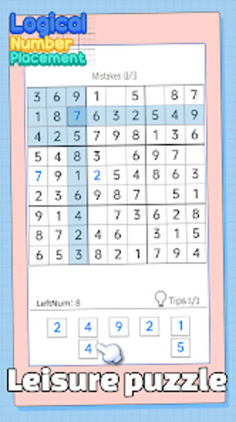 Spelet innehåller flera svårighetsnivåer, inklusive lätt, medel och svår, vilket gör det tillgängligt för både nybörjare och erfarna spelare. Den lugnande designen och de intuitiva drag-och-släpp-mekanismerna gör det enkelt att spela, vilket gör det till ett utmärkt val för avkoppling och hjärngymnastik. Logical Number Placement erbjuder en idealisk plattform för Sudoku-entusiaster att njuta av pussel utan press.